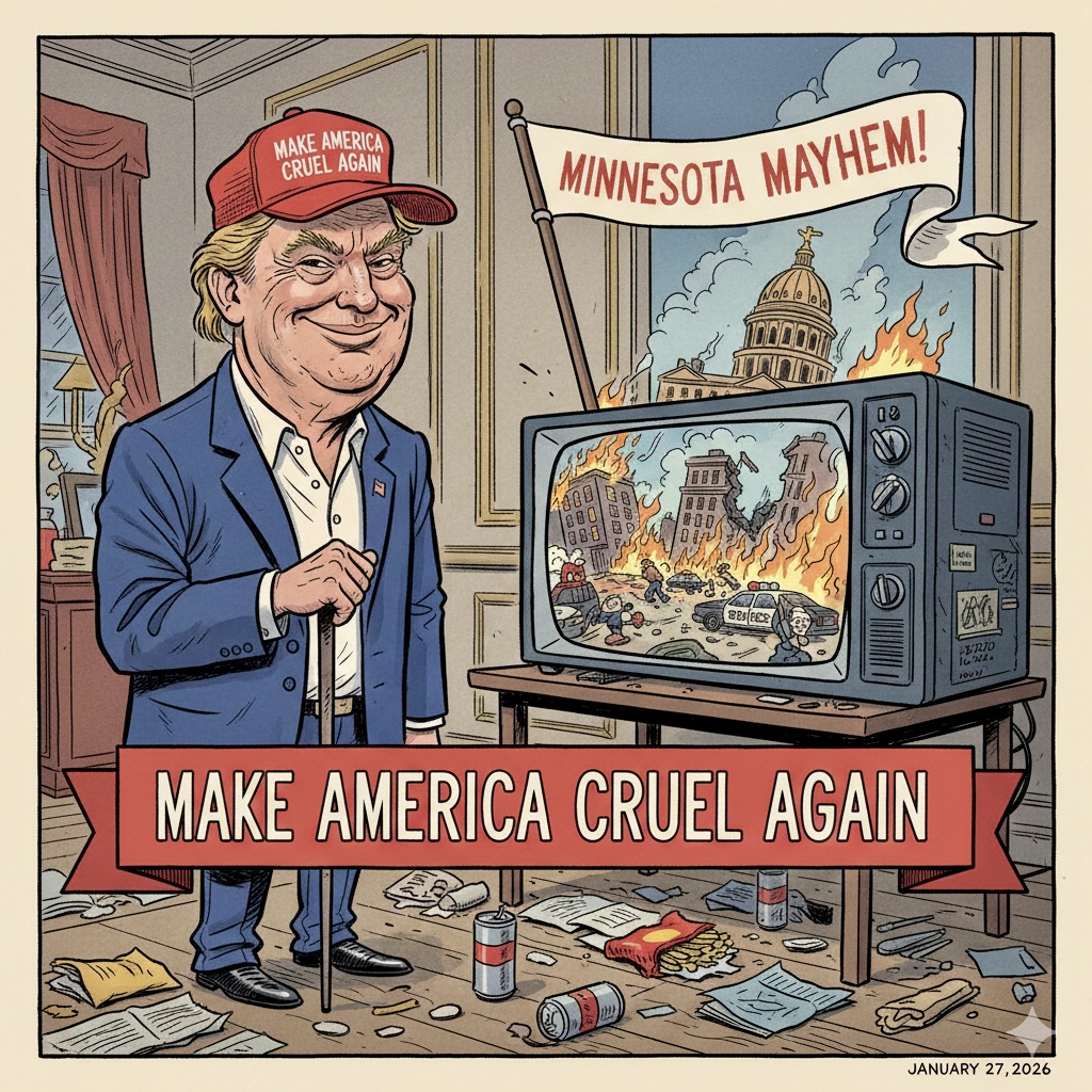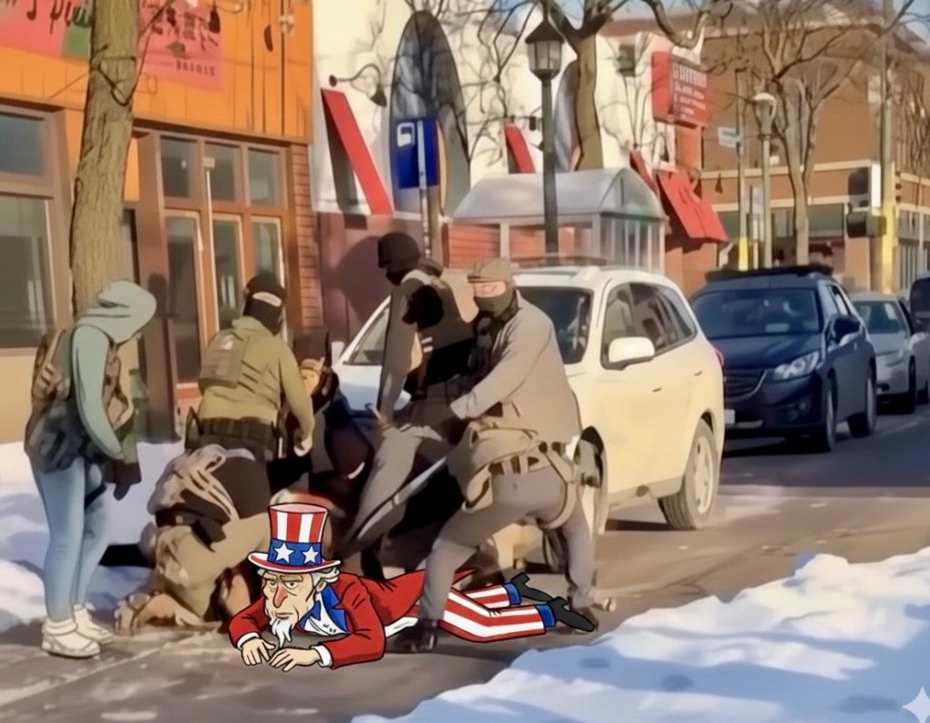 Trump, between terms, blocked bipartisan efforts at immigration reform. Why? Because this was his premier wedge issue. His “birther” brand. The one with which he could divide the country and provoke confrontations that fit perfectly into his long-planned overreach on executive power. In yet another spot-on characterization, with Trump “cruelty is the point” (that is, when it isn’t vanity and/or greed, though often all three in combination). But, as Matt Bird says, the full story doesn’t end there. When cruelty has become the point — as the despicable actions of ICE and the absurd obfuscations/propaganda coming from Trumpf, SS Miller, ICE Barbie, Bondi, Hegseth, et al. have proven — then they have fully lost their moral legitimacy (do they care?) and must be met with equal strength, based on those founding principles of truth and justice. In short, these lying, bullying fuck-wads must go, and, as Nick (Sheldon Leonard) in “It’s A Wonderful Life” put it, “through the door or out the window!” Via the courts. At the ballot box. In the public conscience. From the legitimate press. All of these. The ICE agents must be de-masked (and, ideally, raw-dogged). And this utter fallacy of “absolute immunity” must be thoroughly challenged. Because the Proud Boys are no longer “standing by,” they are in the streets of Minneapolis and are wreaking bloody havoc, just as they did to the cops at the US Capitol on Jan 6.