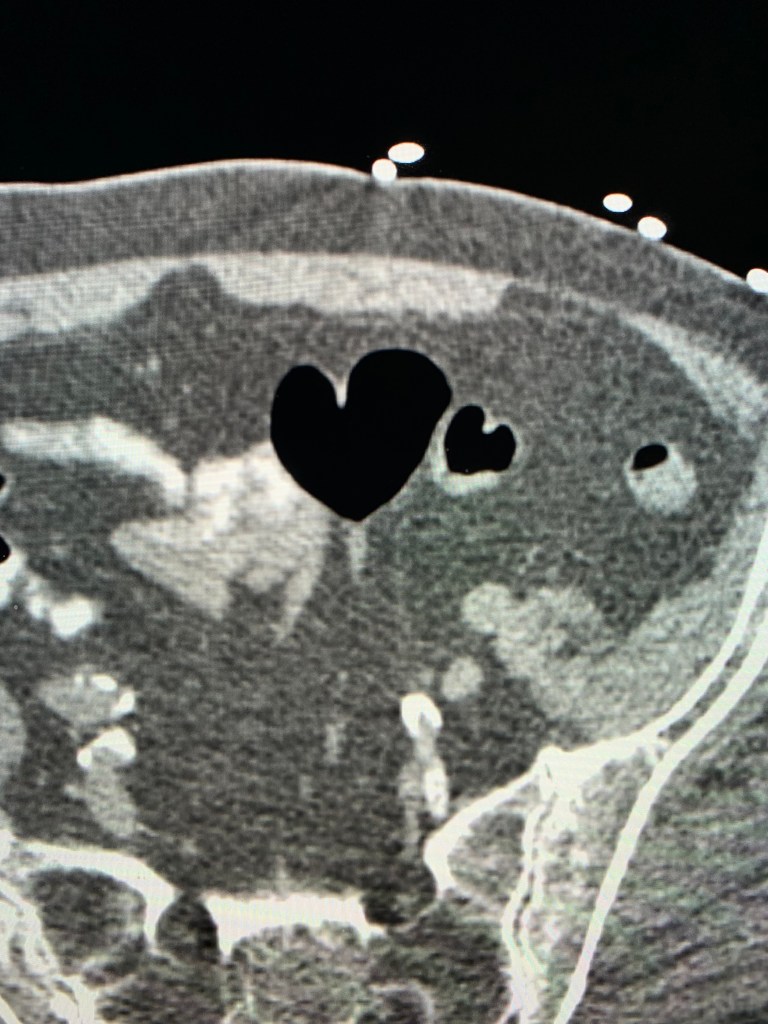 Axial CT image of the abdomen shows two heart-shaped foci of gas within the sigmoid colon