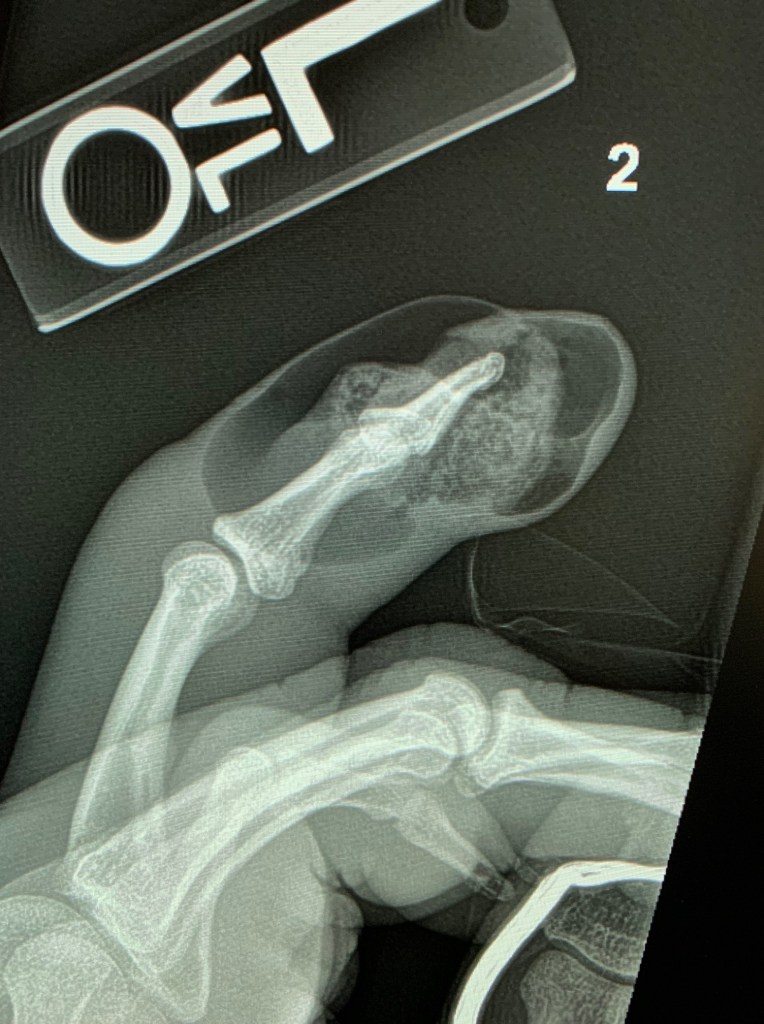 Radiograph of index finger shows soft tissue swelling and gas in the setting of infection.