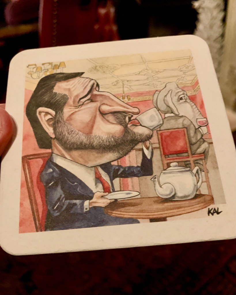 As I looked more closely at this comic coaster portrayal of the despicable and abhorrent and cowardly and smug and oleaginous and duplicitous and prevaricating — you could literally teach an SAT prep class on pejoratives with him — Ted Cruz (R-Texas), I homed in on the GOP elephant sitting at the bar. Notice that his trunk is, ah, truncated (pause for applause), and that it is also continued in disembodied form as the snout/spout of that uber-loser Cruz’s teapot. Furthermore, I would note that the teapot is purposefully positioned directly under the derrière of the seated elephant, who is giving him the side-eye. If you complete the circuit, you have the clever pachyderm drinking the wine/Kool-Aid which gets figuratively crapped out into the teapot that forms a second visual arc up that ultra-idiot Cruz’s arm and into his cup for him to slurp down like the giant poseur-fool that he is. What a genius, that artist (KAL is Kevin Gallagher, the heavily-decorated editorial cartoonist for The Economist and The Baltimore Sun)!