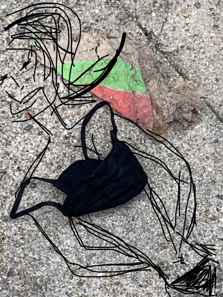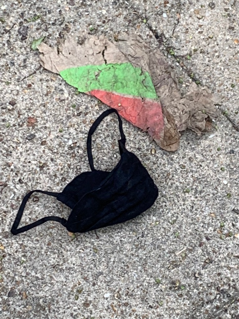It was my habit over the early to middle COVID days to capture images of abandoned masks in their myriad shapes and colors, as well as their variation in condition and repose. It was also my habit to share some of these in group texts with friends, which was generally encouraged, or at least well tolerated. Several friends responded with excellent images of their own from different parts of the country (one of which was shared previously and more to come!), and we amassed quite a documentary collection. But there was one friend, named Betsy, who responded in the most remarkable way. She would, literally in just a few minutes, fire the image right back at me and deliciously illustrated. It was a talent I had no idea she possessed. And I very much love how people you have known for decades can still surprise you in this way. How we can fully amaze each other with unseen abilities and passions.