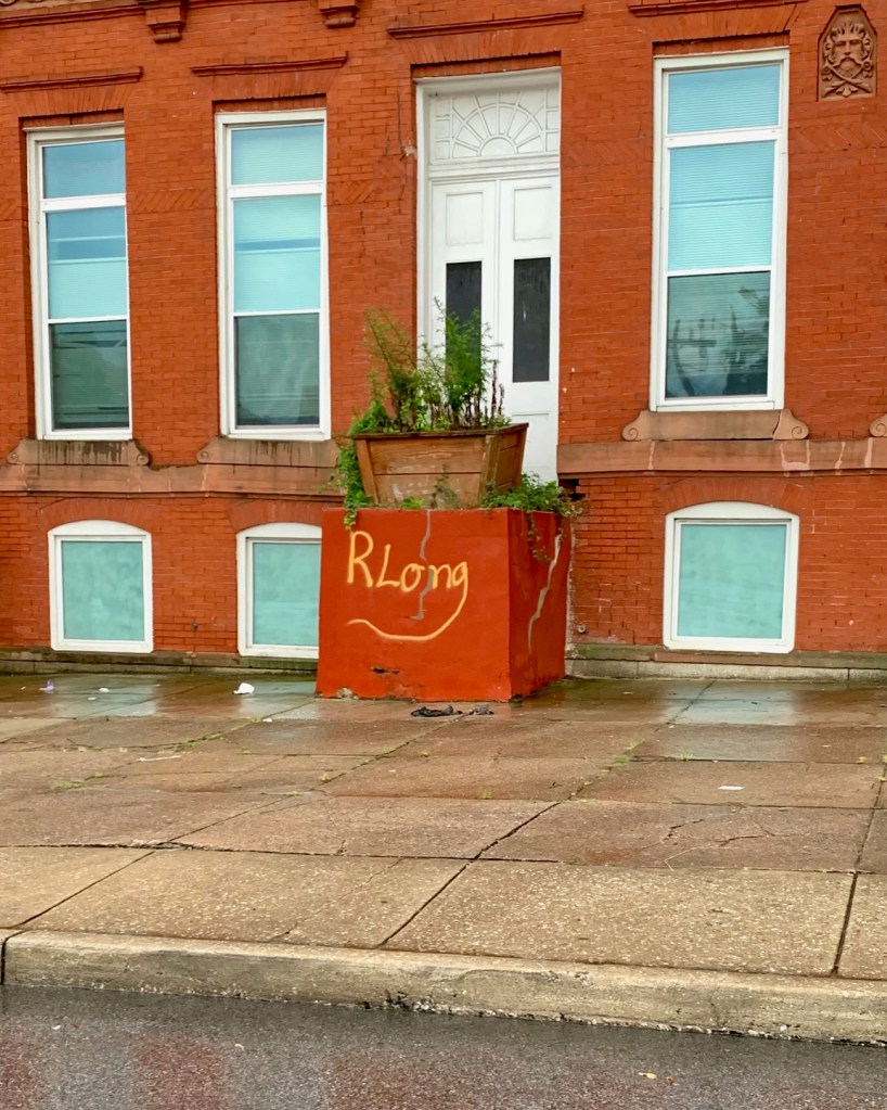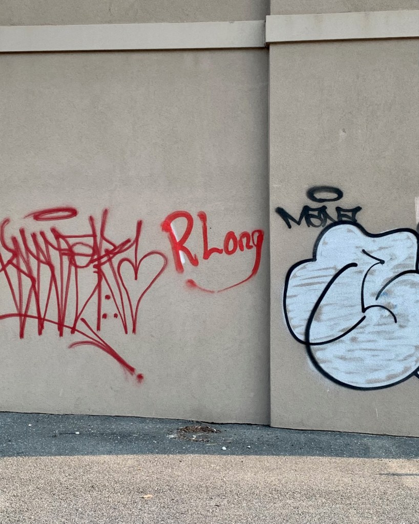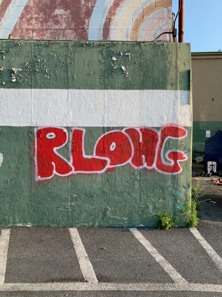 Don’t be like R. Long, here. Because it’s more like R. Lame. Severely anemic in style and completely lacking in the bold expressiveness of his/her fellow taggers (I wonder what percentage of street artists are women and also how we might “raise awareness” about them). Yes, there’s that skinny swoosh that tracks back from G to R. But, then, why not connect those two letters? Take steps, friend. Take steps. Up your game. Find your voice and declare it loudly-proudly to the world. There are few things sadder than poorly executed graffiti. And there’s a lesson in this for each of us: Don’t be R. Lame…