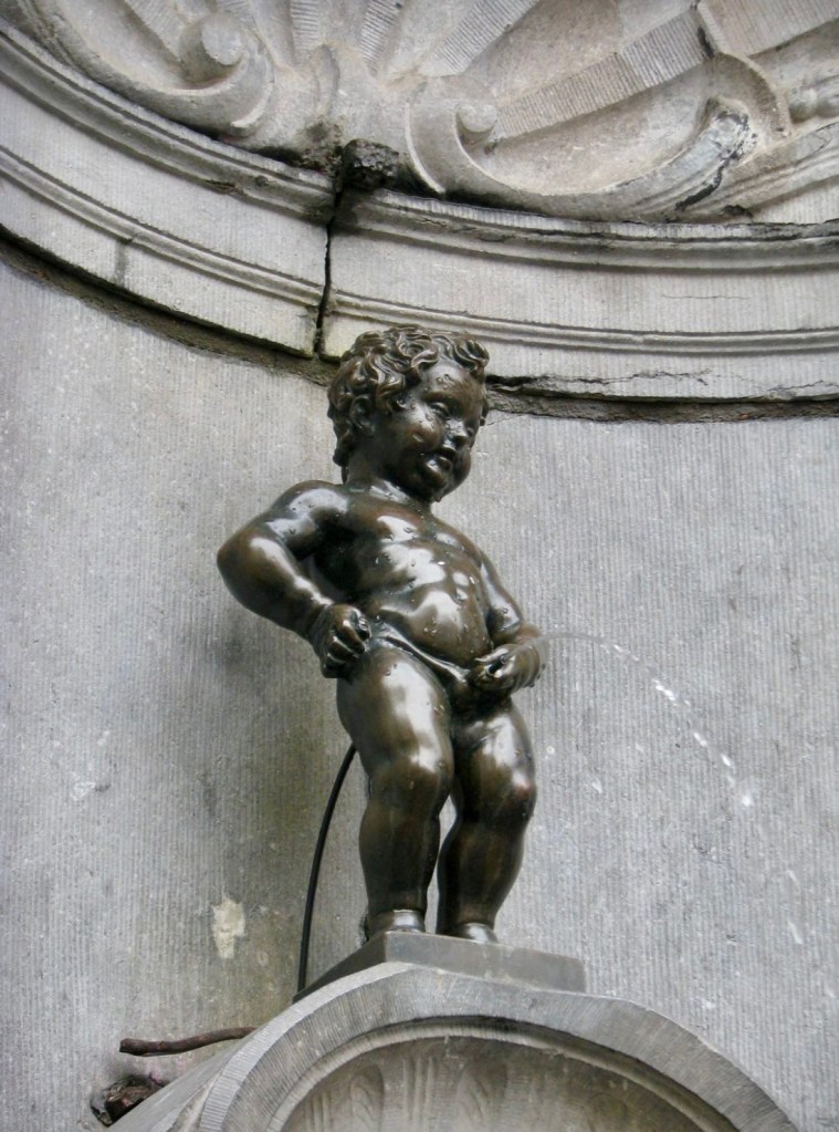 I had chance to visit Brussels some years ago and predictably, guided by Fodor’s, sought out the famed Menneken Pis. Who doesn’t love kissing and/or pissing cherubs? Yet I’m sure I’m not first to leave disappointed. It’s awkwardly situated, undersized, and the water mechanism is clumsy. To sum, the history is much more impressive than the actual. Per Wikipedia, the original was made in the mid 15th century. The bronze version dates from around 1619, which has been repeatedly damaged, stolen and reclaimed over the centuries. A bronze replica (above) was stood up in 1965 after a thief broke the original bronze off at the ankles. It turned up the next year in the Charleroi Canal following an anonymous tip and is now kept dry at the Brussels City Museum. The stone niche was added in 1770, and the statue has become a recognized symbol of Brussels/Belgium (“belgitude” = the Belgian penchant for a whizzing self-mockery). The Manneken Pis is dressed in costume several times a week (about 1000 total, so far) according to a fixed schedule, all managed by a non-profit. Designs are submitted annually and The Order of the Friends of the Manneken Pis form the selection committee. There is now a special museum to house the many outfits. And while the town of Geraardsbergen claims an older version of the statue, the prevailing view is that they don’t have a bucket to piss in.