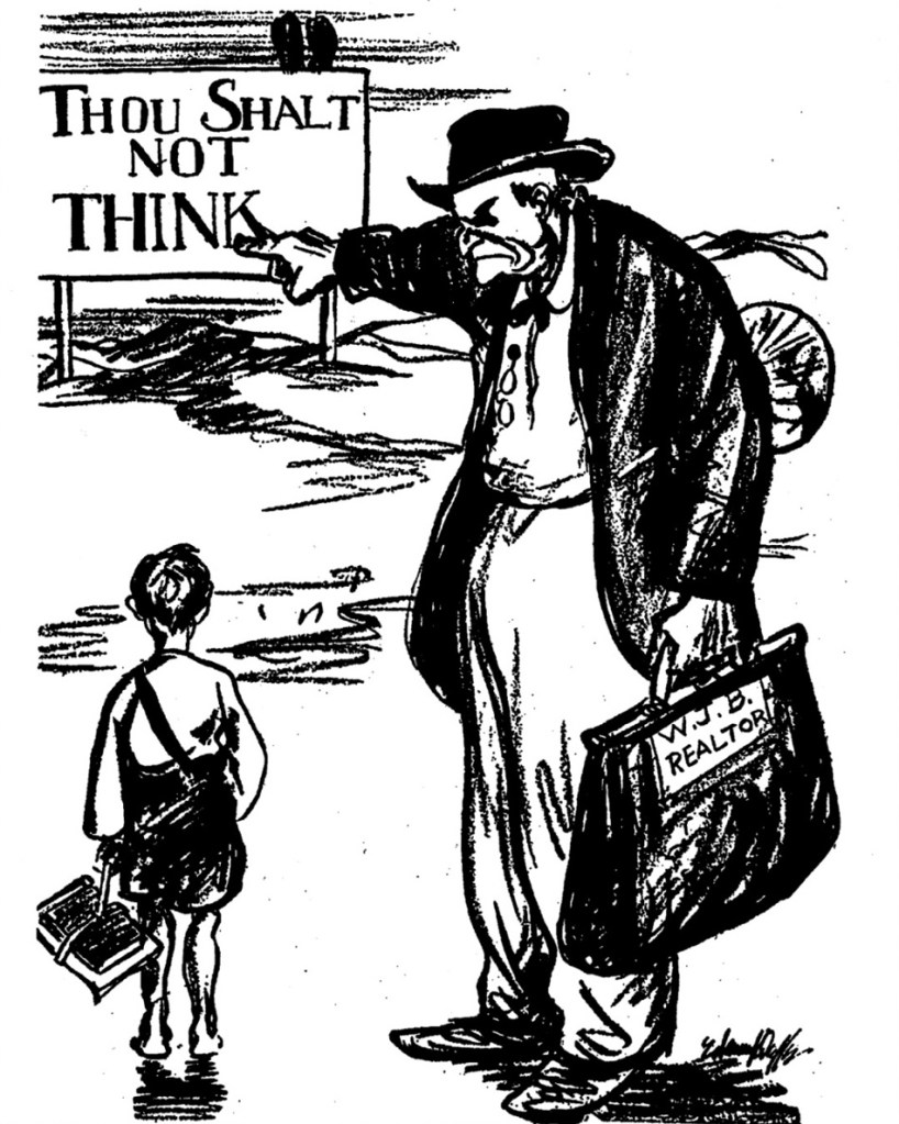 “I sincerely hope that the nobility and gentry of the lowlands will not make the colossal mistake of viewing this trial of Scopes as a trivial farce. Full of rustic japes and in bad taste, it is, to be sure, somewhat comic on the surface. One laughs to see lawyers sweat. The jury, marched down Broadway, would set New York by the ears. But all of that is only skin deep… when the curtain falls at least all the laughter may be coming from the yokels. You probably laughed at the Prohibitionists, say, back in 1914. Well, don’t make the same error twice… Now the clowns turn out to be armed, and have begun to shoot.”