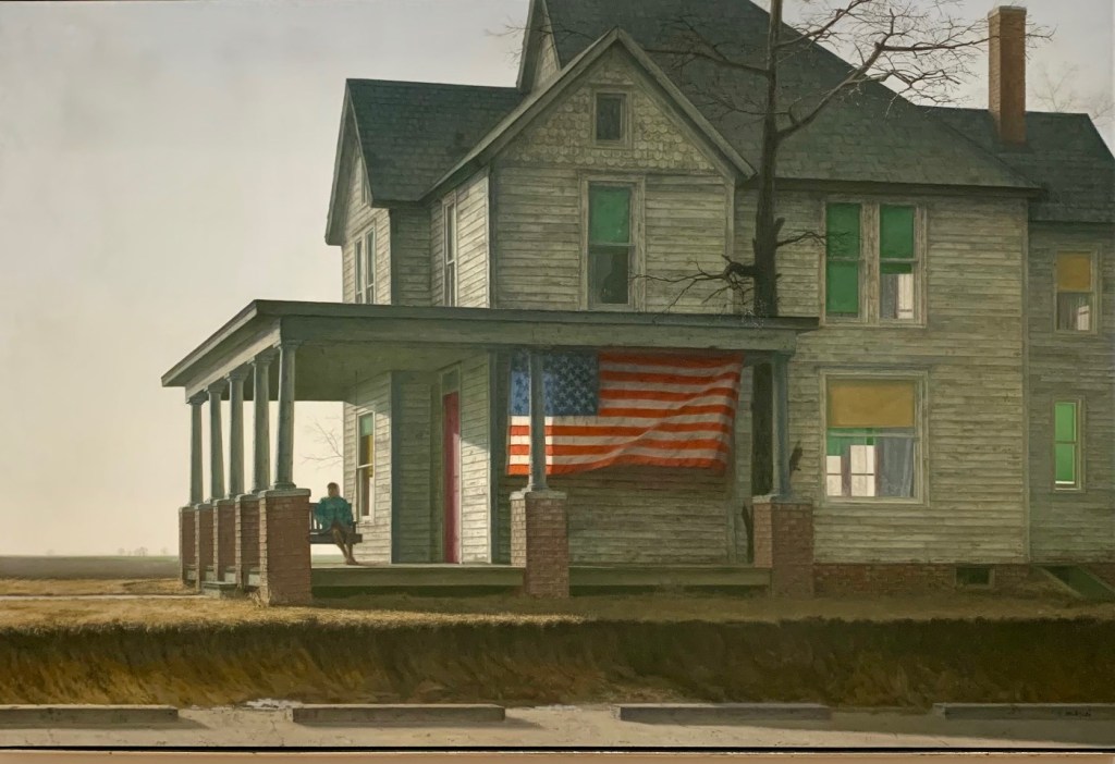 There’s a stillness and withholding in this scene that, for me, fondly recalls Edward Hopper. But note also the gentle breeze ruffling our national flag. It’s sunny but not exactly warm out there somewhere in America’s heartland. The house’s interior signals absence and the barren tree suggests the season’s end. There’s a lone soul on a porch swing, presumably Eve, pondering God knows what. And is that red door portending what it is that red doors sometimes portend?