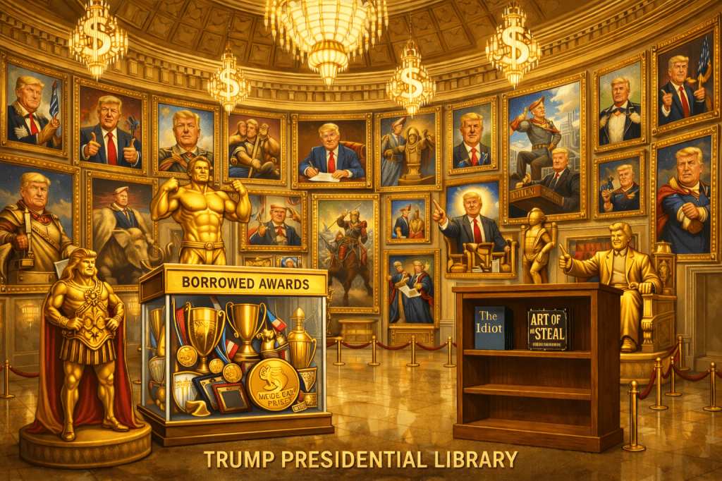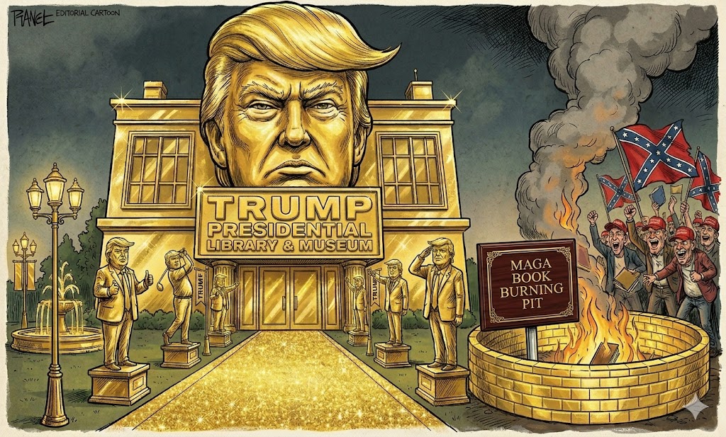 Maybe for the future, in the interest in keeping building costs down, presidential libraries should only contain items actually read or viewed by that particular president. In the case of Trump, this would amount to maybe three of four books about himself and the various MAGA-zines that featured profiles of him. Plus a bunch of vintage porn mags and sex tapes, including the Stormy Daniels collection. But mostly just comic books and cartoons from his childhood. His motto could vamp on that of McDonald’s: “Over One Billion Books Burned!”