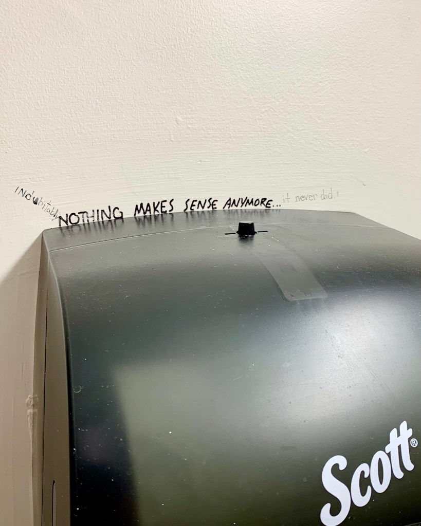 “Does nothing make sense to you anymore? Well, you are not alone. And that’s why the good people at Scott’s have invented the bathroom Life-Sense Dispenser. Simply condense any unpleasant thoughts clogging your mind and imagine them flushed downstream with your bodily waste. Then wash your hands vigorously for 30 seconds and pass your hand beneath the light source. You will receive a luxuriously soft towelette inscribed with a guaranteed life-changing piece of advice that will put you well on the road to blissful serenity! Certain restrictions apply. Not available in all locations.”
